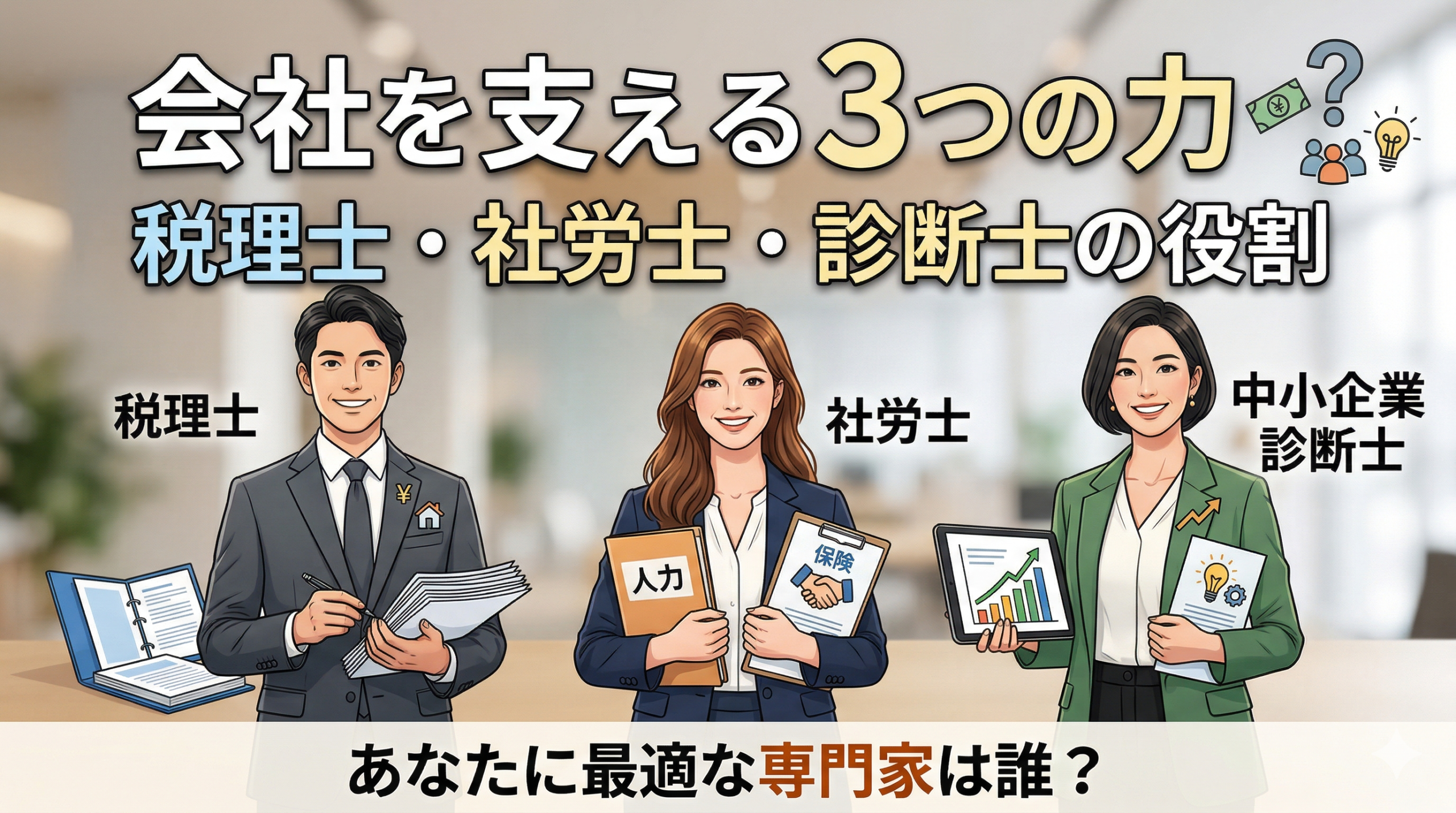 特に、税理士・社会保険労務士(社労士)・中小企業診断士の3つは、中小企業にとっての「三種の神器」とも呼べる存在です。